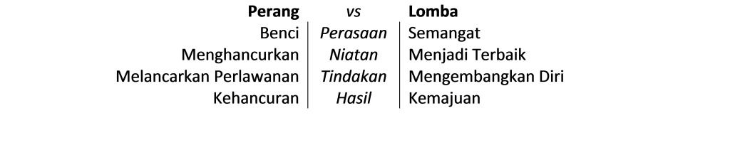 Malahan, energi nasionalisme yang melimpah ruah itu tak benar jika diwujudkan dalam wujud kebencian. Benci adalah energi untuk menjatuhkan pihak lain. Tapi kita tak lagi sedang berperang. Itu sebabnya kita tak punya cukup alasan lagi untuk membenci negara lain, lalu mengangkat senjata untuk menghancurkan, seperti pahlawan kemerdekaan. Kita sudah tak lagi berperang, tapi kita sedang beralih ke jenis ‘perang’ yang lain. Kita sedang berlomba. Kita Indonesia berjajar dengan negara-negara lain yang sudah merdeka, hidup bukan lagi untuk menjajah kehidupan lain, tapi sedang hidup untuk mewujudkan kehidupan terbaik dari yang lain. Sekali lagi, bukan peperangan, tapi perlombaan. Ini sangat penting, sebab dua pemahaman ini punya dasar niatan dan konsekuensi hasil yang sangat berbeda1. Coba bandingkan:
