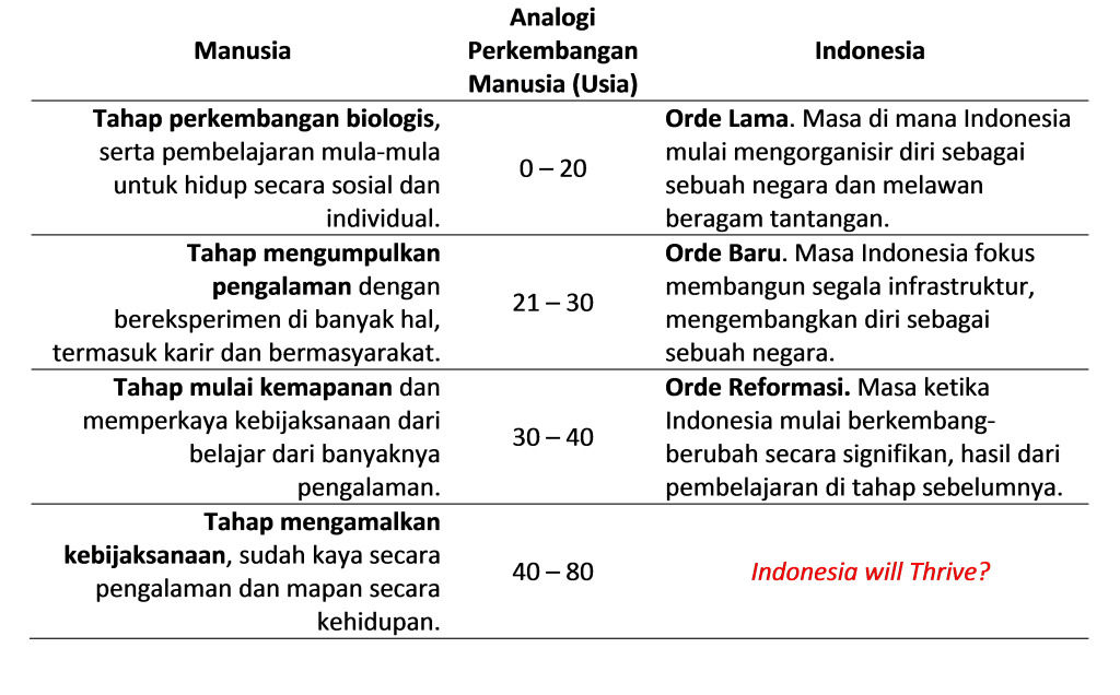 Saya sadar analogi di atas sama sekali tidak ilmiah. Tetapi bukankah fungsi sebuah analogi adalah untuk membantu kita menyederhanakan dan memahami sesuatu? Dan kesamaan proses perkembangan Indonesia sejak merdeka dengan proses perkembangan manusia sebagai pribadi, terlalu menarik untuk diabaikan.