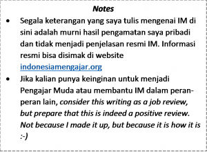 Kabar baik yang lain, selain capaian-capaian gerakan pendidikannya, IM ternyata adalah organisasi yang punya prestasi dalam hal akuntabilitas. IM selama 7 tahun berturut-turut berhasil mendapatkan predikat WTP (Wajar Tanpa Pengecualian), sebuah penilaian audit tertinggi, yang dilakukan oleh firma akuntan terkemuka PwC. Saya tahu di luar sana banyak organisasi non-profit yang kurang amanah, yang memanfaatkan dana atau dukungan dari masyarakat untuk kepentingan yang tidak dilaporkan. Tapi selama di IM saya menyaksikan sendiri bagaimana dukungan mitra dikelola dengan baik. Jadi jika kalian menyalurkan iuran publik untuk IM dan Pengajar Muda di daerah, kalian bisa tenang sebab dukungan kalian tiba di tangan yang tepat. Dan semoga hal ini bisa diteladani oleh oleh organisasi-organisasi sosial yang lain.